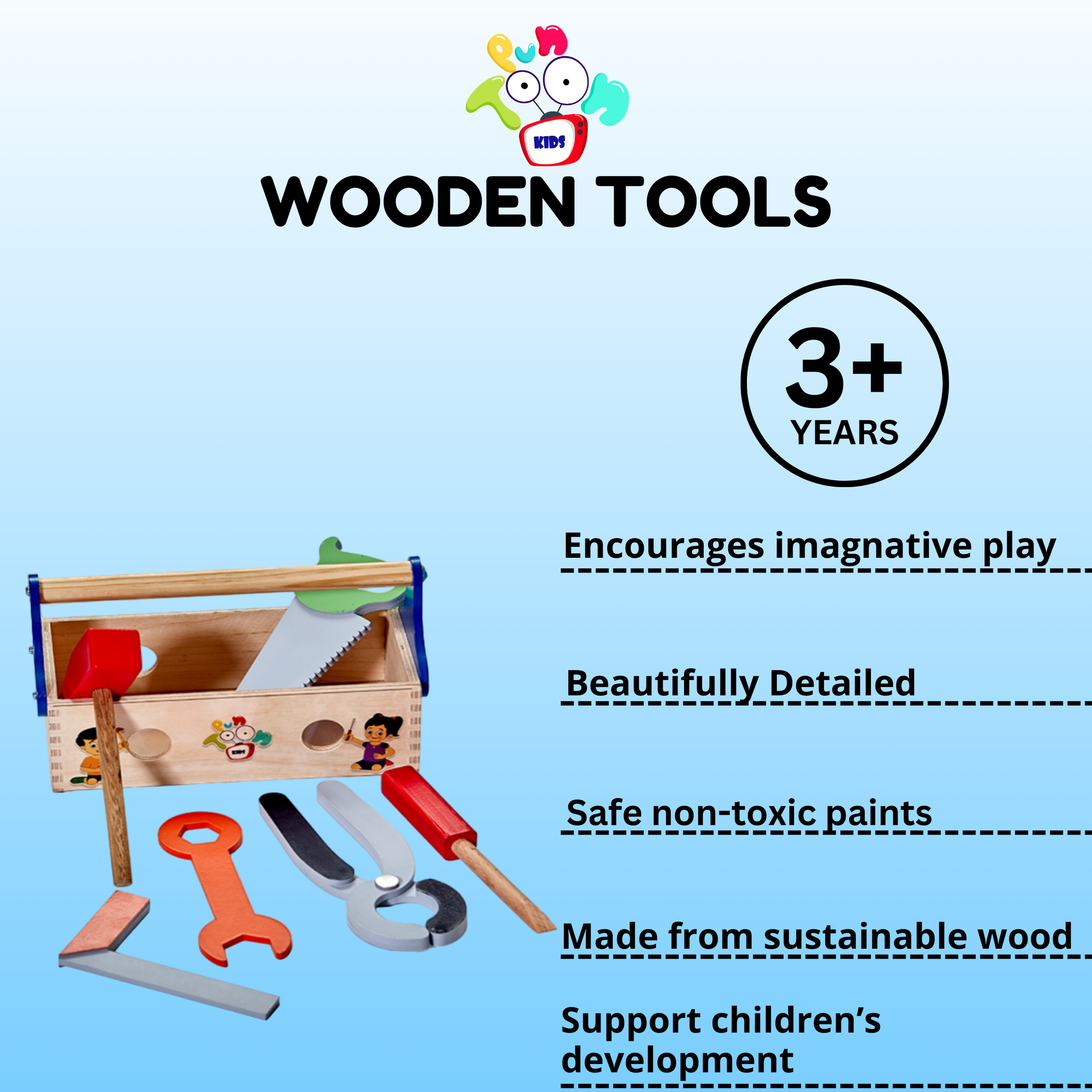 PunToon Kids Wooden Tool Kit is the perfect pretend play construction tools set designed to ignite your child's imagination and creativity! Ideal for young builders aged three years and above, our comprehensive kit provides infinite opportunities for immersive play and skill development. Crafted from durable wood, our kit contains everything your little builder needs to embark on fun construction adventures, including hammers, screwdrivers, wrenches, and saws. With its realistic features and sturdy construction, our Tool Kit serves as the ideal platform for pretend play, allowing youngsters to explore the world of building in a safe and engaging manner. Whether they're building skyscrapers or fixing imaginary automobiles, our Tool Box fosters creativity and problem-solving abilities, nurturing their confidence with each project completed. More than just a toy, our wooden tool kit promotes crucial developmental skills, including social interaction, language development, and hand-eye coordination. Versatile enough for playrooms or childcare centres, it enhances playtime experiences and sparks your child's imagination. Introduce your child to the world of construction with the PunToon Kids Wooden Tool Kit today!