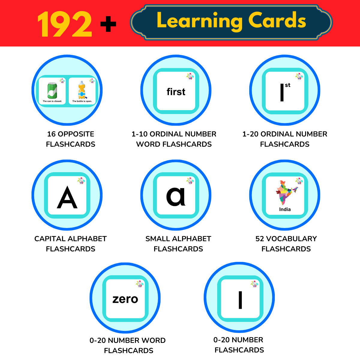 PunToon Kids Early Learning Flashcards for Kids, the best educational tool for stimulating young minds and promoting early growth! Our comprehensive pack of 192 flash cards covers key topics such as phonics, numbers, and opposites, making it an ideal learning aid for preschool and kindergarten-aged children. Phonics flash cards help children master letter sounds and phonetic awareness, creating a solid foundation for reading and language skills. With our number flash cards, children will explore the world of mathematics and numerical concepts in a fun and engaging way. with our Opposite Flash cards Introduce the concept of opposites, stimulating critical thinking and vocabulary expansion Each flashcard is meticulously created to captivate children and encourage interactive learning experiences. Children learn critical thinking, memory retention, and problem-solving skills through educational and cognitive games for kids, preparing them for success in school and beyond. Our flashcards are not only educational but also adaptable! Whether used in the classroom, at home, or on the go, these flash cards offer limitless options for early learning and skill reinforcement. Invest in your child's future with Puntoon Kids Early Learning Flashcards. With our fascinating learning tool, you can spark your child's interest, stimulate creativity, and watch him or her begin on an adventure of discovery and academic achievement.